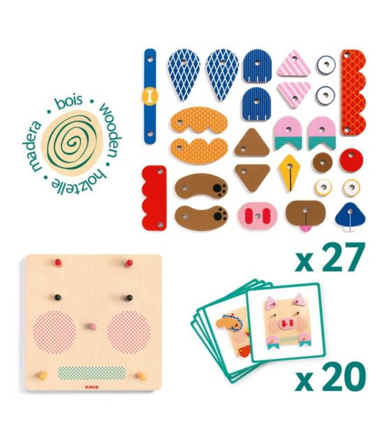 Consta de un tablero de madera con clavijas y 27 rasgos faciales de madera que se pueden intercambiar para crear y construir miles de animales diferentes.