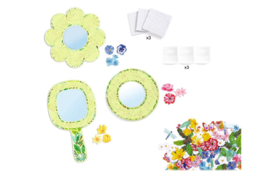 - Un kit creativo para decorar 3 espejos. Con pegotines de espuma y decoraciones florales.