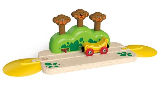 Tres monos se esconden en la jungla esperando su oportunidad de arrebatar un banano. ¡Mira cómo saltan justo cuando pasa el coche del plátano!